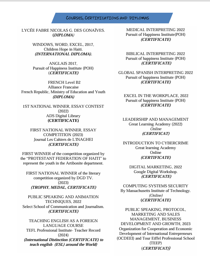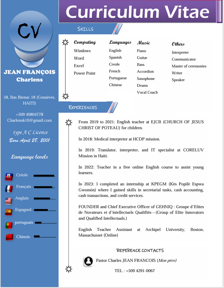 In addition, he secured the FIRST PLACE WINNER in an articulation and reading contest hosted by Youth Space. Among thousands of candidates, his text was also selected as NUMBER ONE in the first phase of a competition focused on the defense of human rights.Charlens is a polyglot fluent in MANDARIN CHINESE, CREOLE, FRENCH, ENGLISH, SPANISH, and currently expanding his linguistic repertoire by learning PORTUGUESE and GERMAN. He is also a professional pianist.